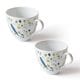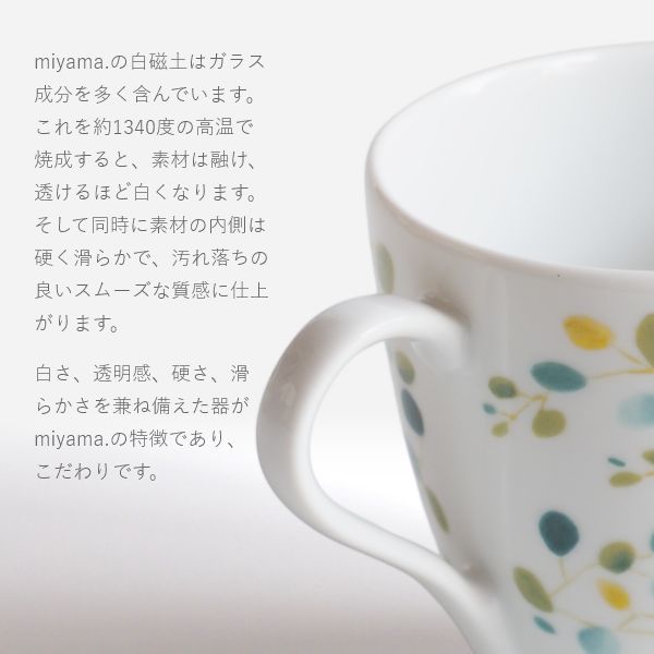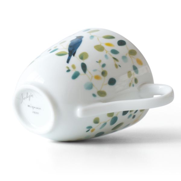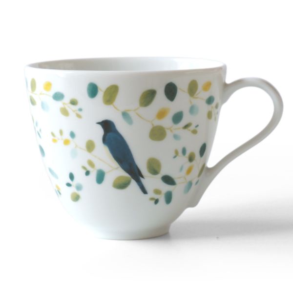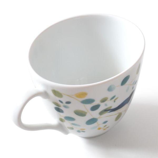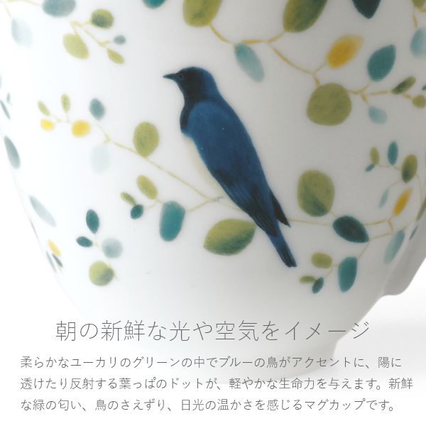 やわらかなユーカリグリーンの色合いに、鮮やかなブルーの鳥がワンポイントで描かれた、心あたたまるデザインのペアマグカップです。