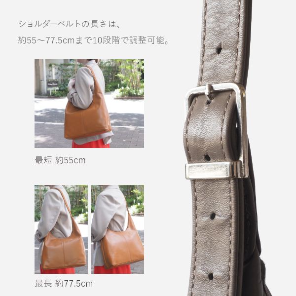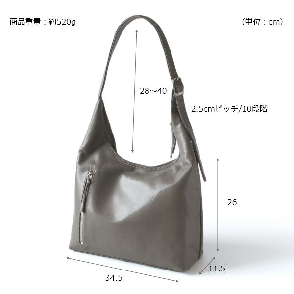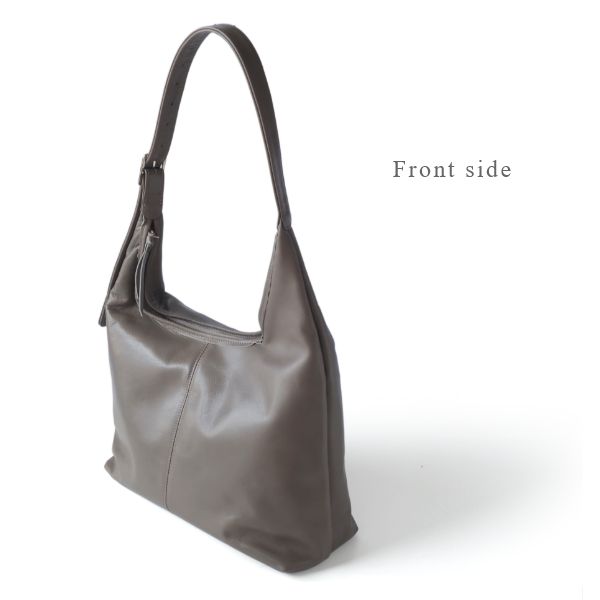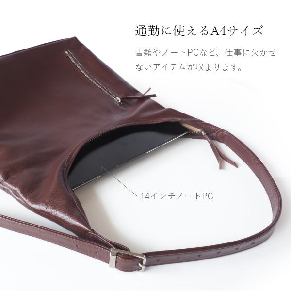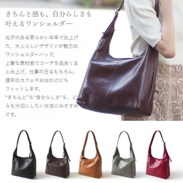 光沢のある柔らかい本革で仕上げた、大人らしいデザインが魅力のワンショルダーバッグ。上質な素材感でコーデを品良くまとめ上げ、仕事の日はもちろん、週末のカフェやお出かけにもフィットします。