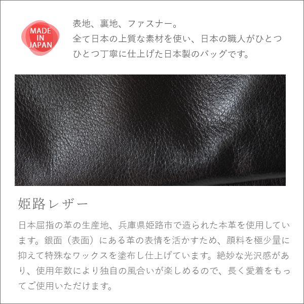 日本屈指の革の生産地、兵庫県姫路市で造られた本革を使用しています。銀面(表面)にある革の表情を活かすため、顔料を極少量に抑えて特殊なワックスを塗布し仕上げています。絶妙な光沢感があり、使用年数により独自の風合いが楽しめるので、長く愛着をもってご使用いただけます。