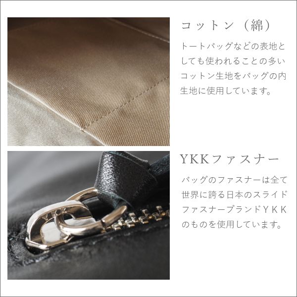 表地、裏地、ファスナー。全て日本の上質な素材を使い、日本の職人がひとつひとつ丁寧に仕上げた日本製のバッグです。