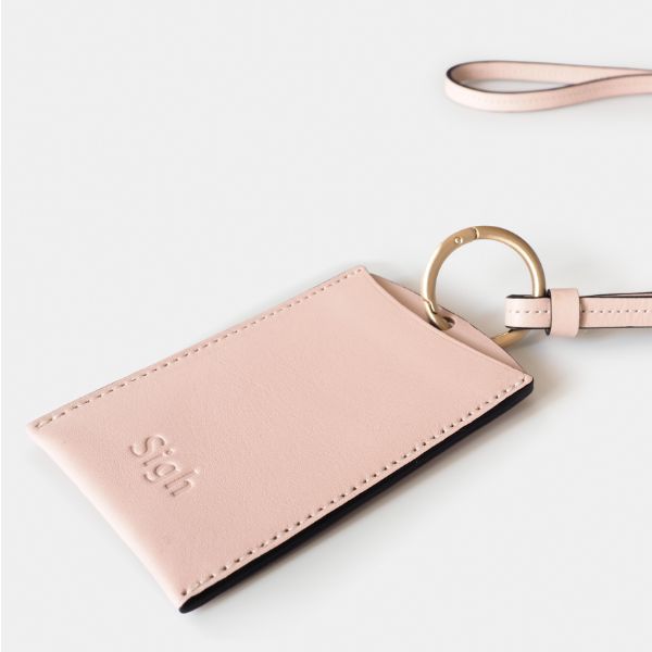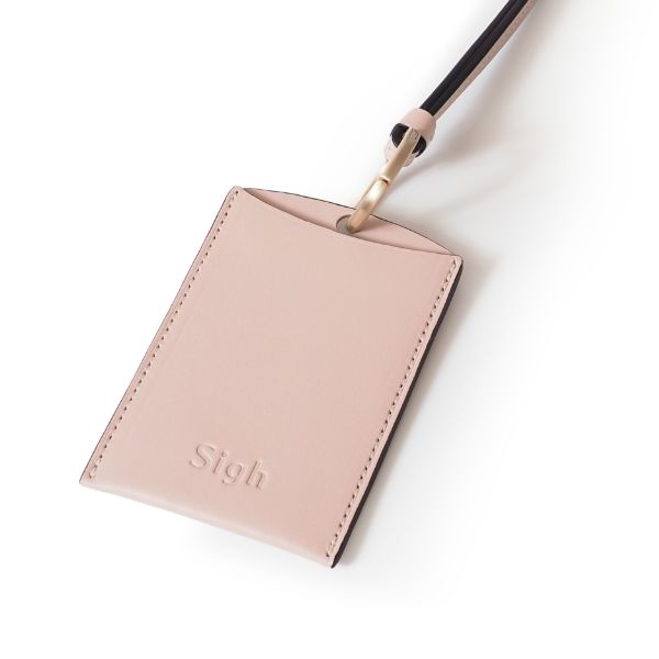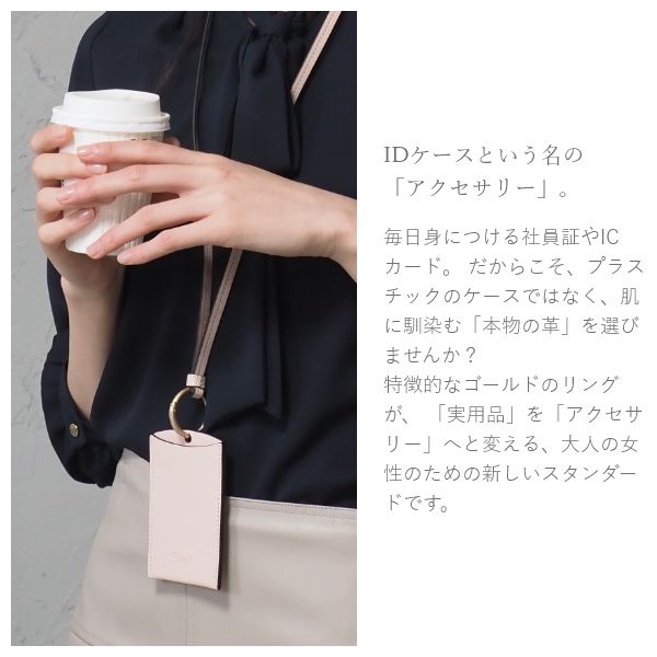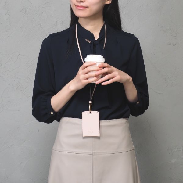 甘さを抑えたスモーキーな色合いに、ブラックのラインを効かせることで、凛とした大人の表情に。 ネイビーやグレーといった定番のオフィスカラーとも相性が良く、胸元にふわりと明るさをプラスします。 ふと心が緩むような優しいピンクのIDケースです。