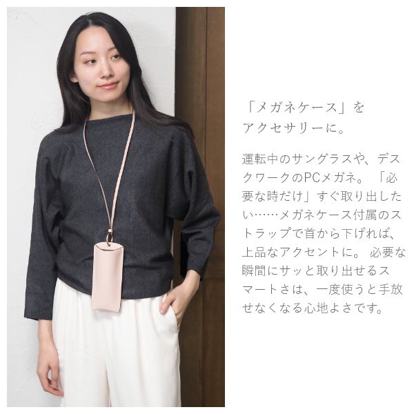 運転中のサングラスや、デスクワークのPCメガネ。 「必要な時だけ」すぐ取り出したい……メガネケース付属のストラップで首から下げれば、上品なアクセントに。 必要な瞬間にサッと取り出せるスマートさは、一度使うと手放せなくなる心地よさです。