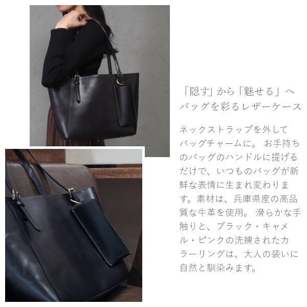 ネックストラップを外してバッグチャームに。 お手持ちのバッグのハンドルに提げるだけで、いつものバッグが新鮮な表情に生まれ変わります。素材は、兵庫県産の高品質な牛革を使用。 滑らかな手触りと、ブラック・キャメル・ピンクの洗練されたカラーリングは、大人の装いに自然と馴染みます。